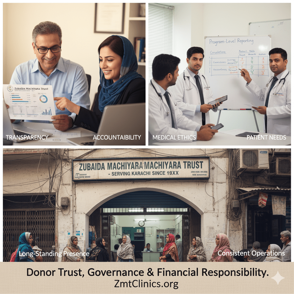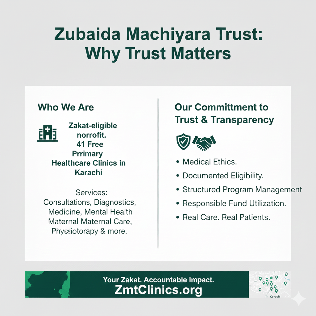 Zubaida Machiyara Trust is a Zakat-eligible nonprofit organization dedicated to free primary healthcare across Karachi. Our work is grounded in medical ethics, transparency, and long-term community engagement.